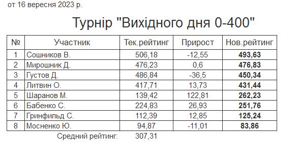 Результати турніру “Вихідного дня 0-400” за 16.09.2023
