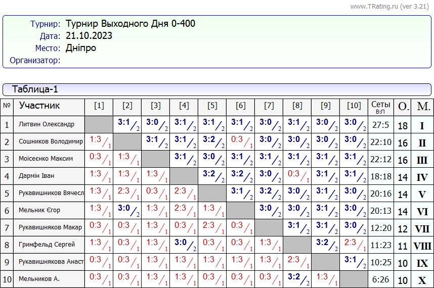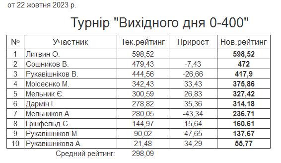 Результати турніру “Вихідного дня 0-400” за 21.10.2023