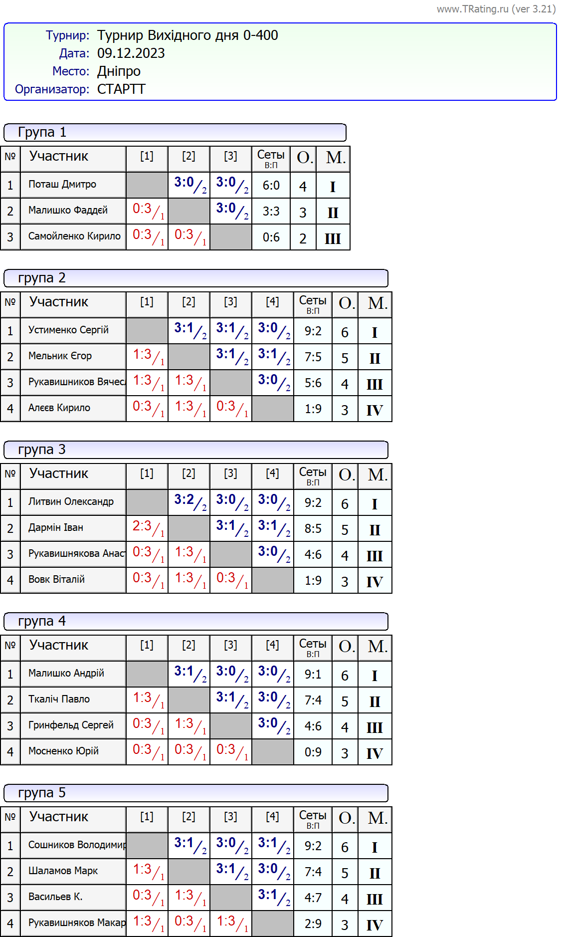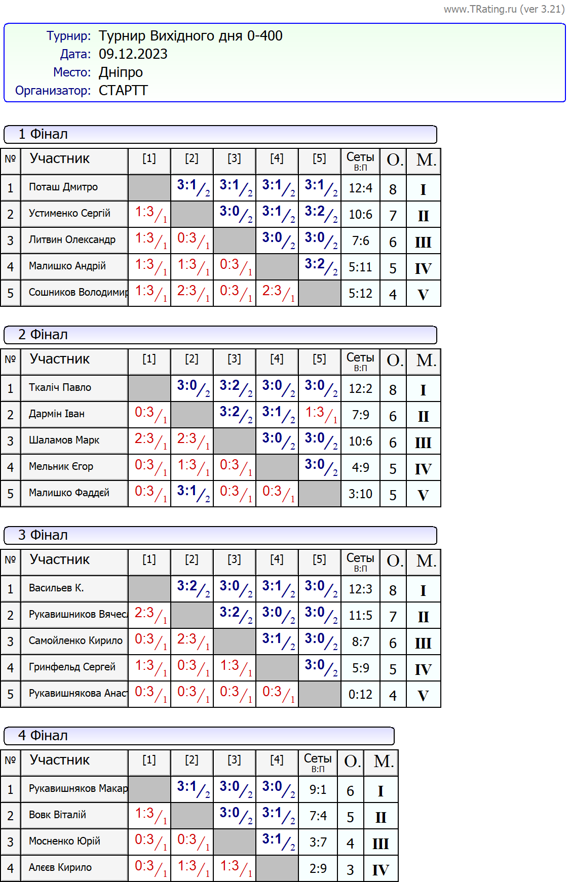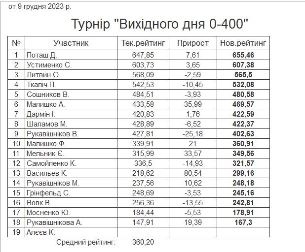 Результати турніру “Вихідного дня 0-400” за 09.12.2023