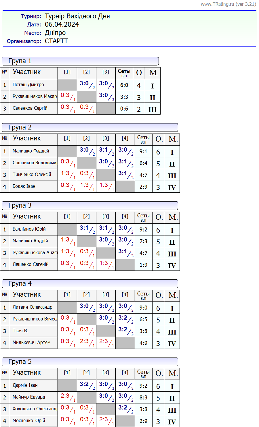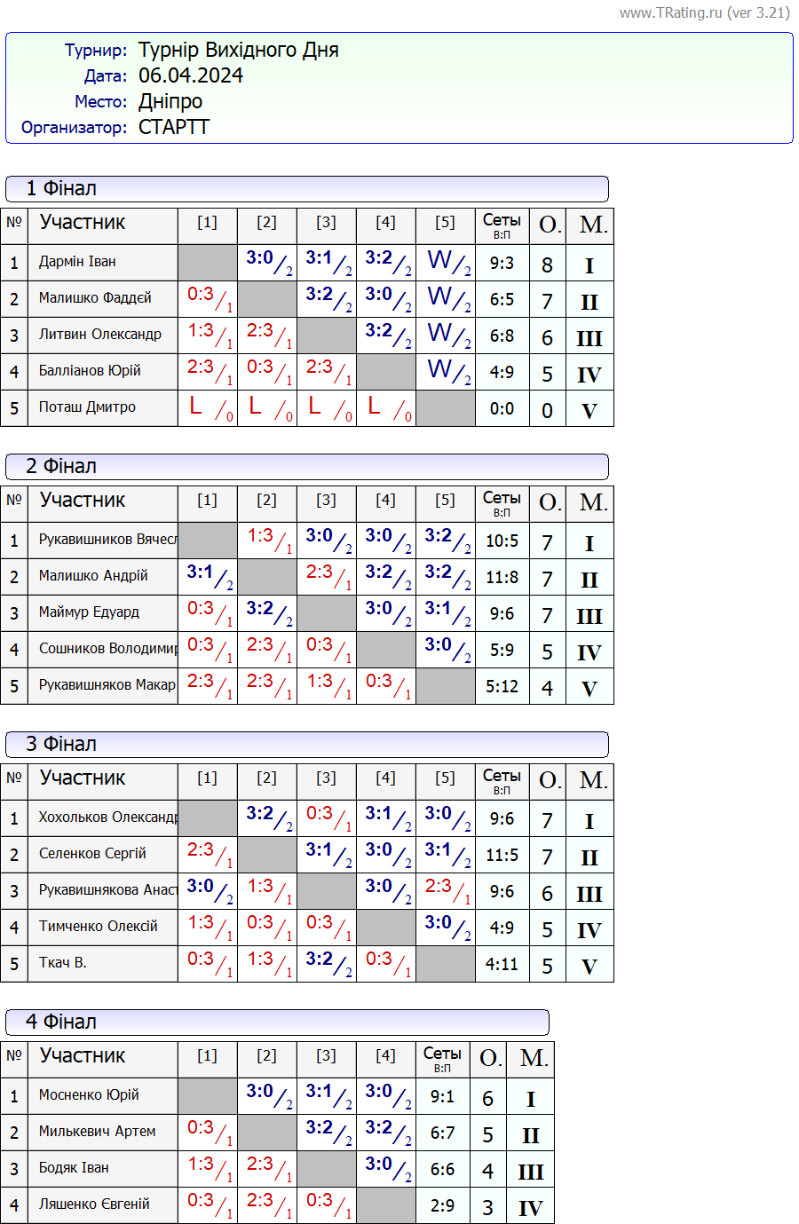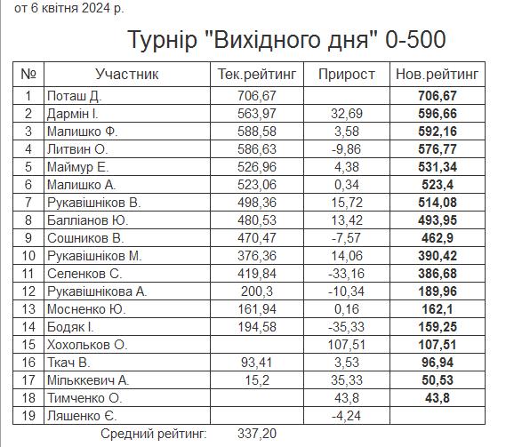 Результати турніру “Вихідного дня 0-500” за 6.04.2024