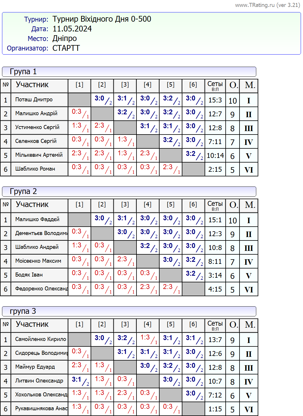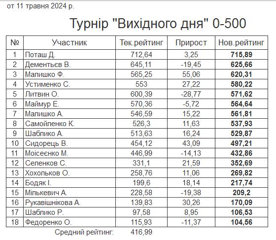 Результати турніру “Вихідного дня 0-500” за 11.05.2024
