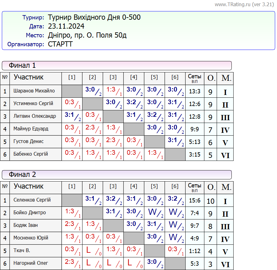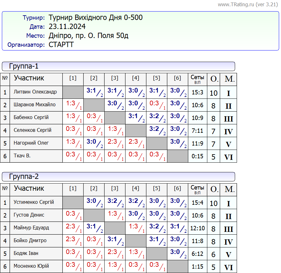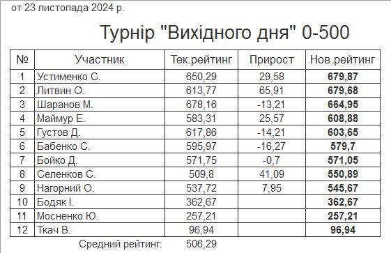 Результати турніру “Вихідного дня 0-500” за 23.11.2024