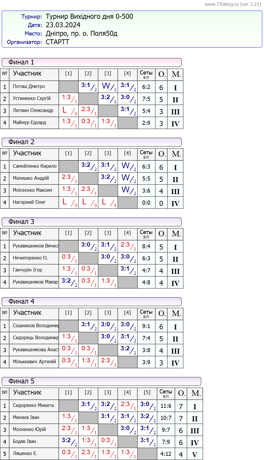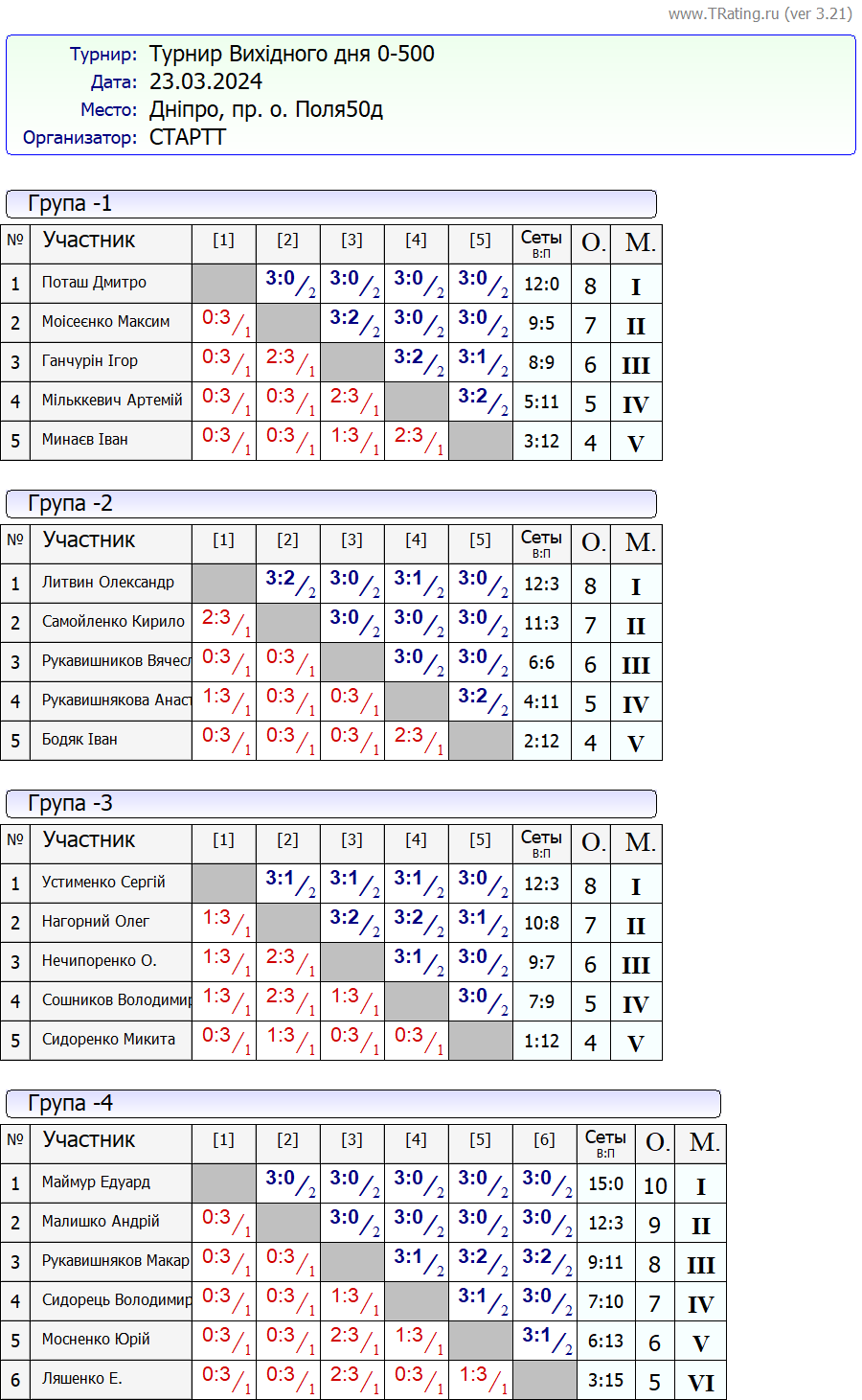 Результати турніру “Вихідного дня 0-500” за 23.03.2024