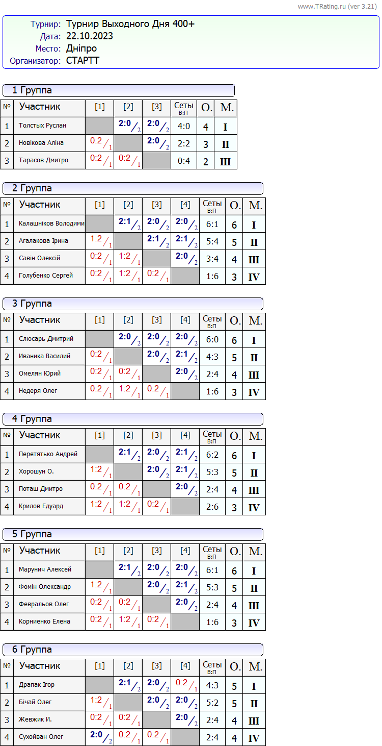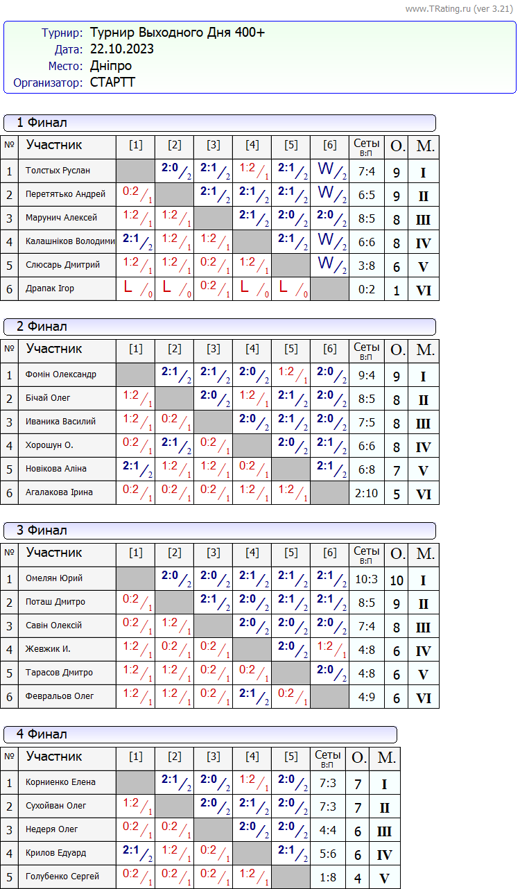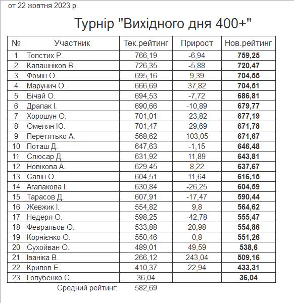 Результати турніру “Вихідного дня 400+” за 22.10.2023
