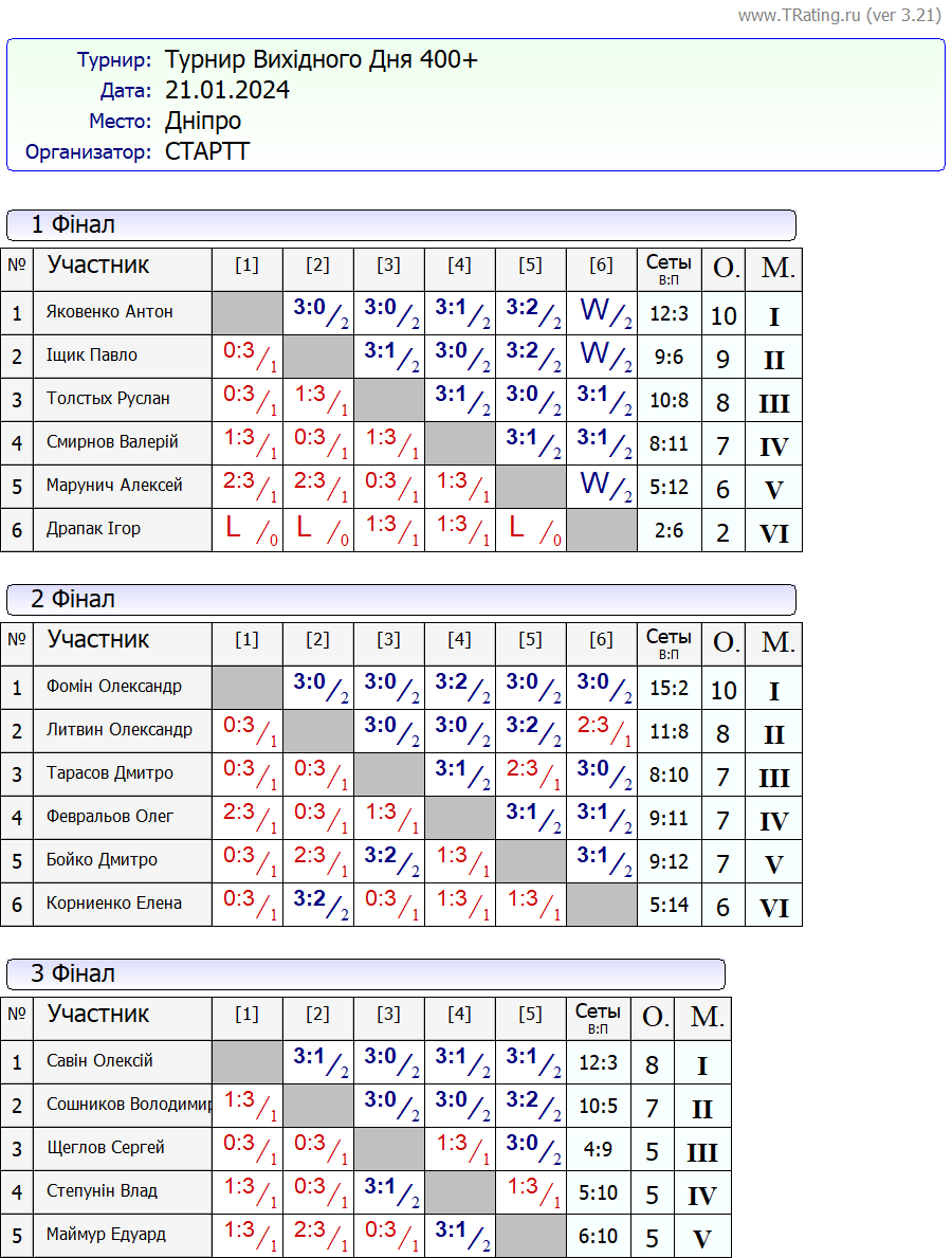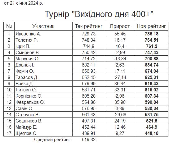Результати турніру “Вихідного дня 400+” за 21.01.2024