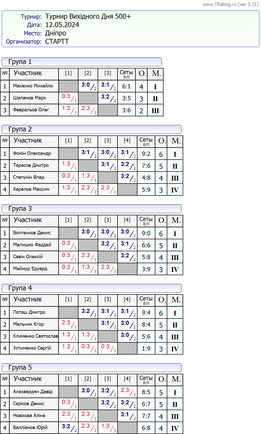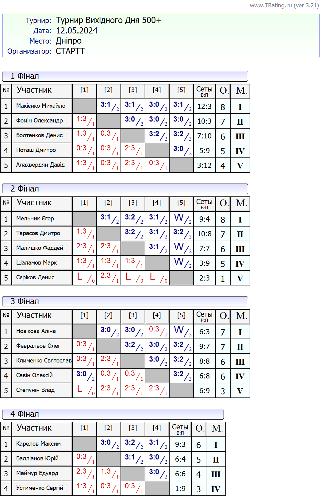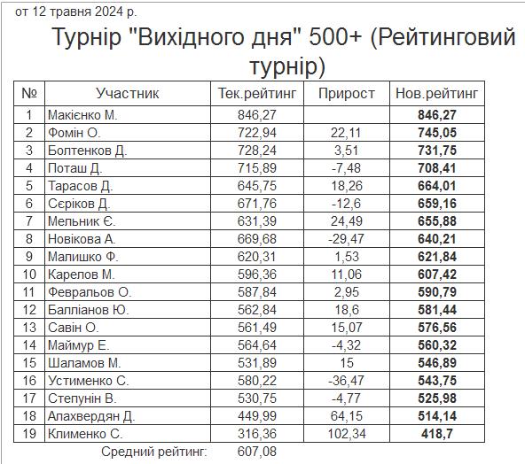 Результати турніру “Вихідного дня 500+ (Рейтинговий турнір)” за 12.05.2024