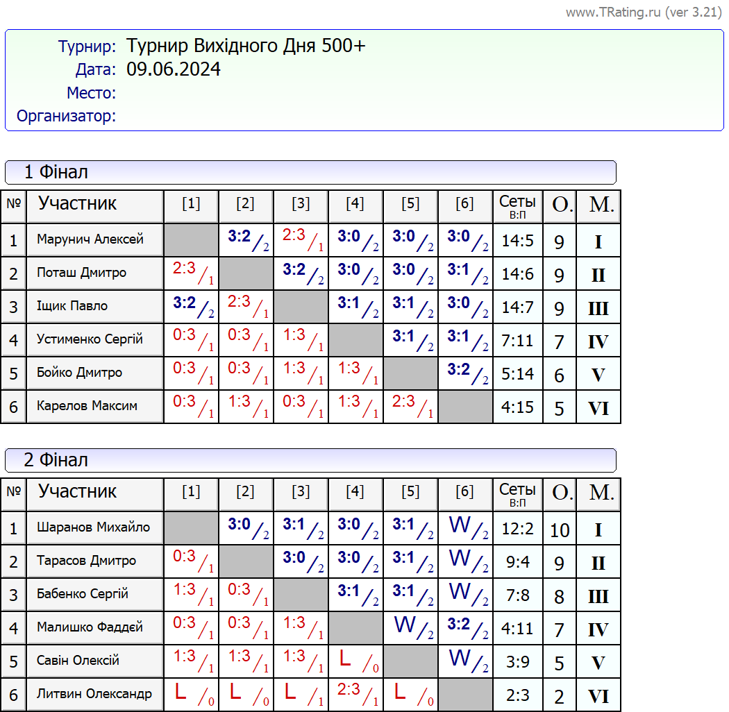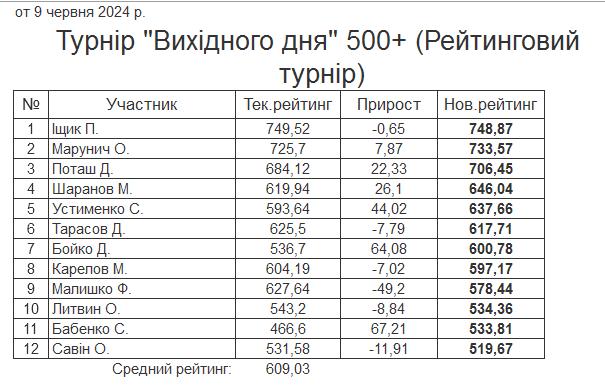 Результати турніру “Вихідного дня 500+ (Рейтинговий турнір)” за 9.06.2024