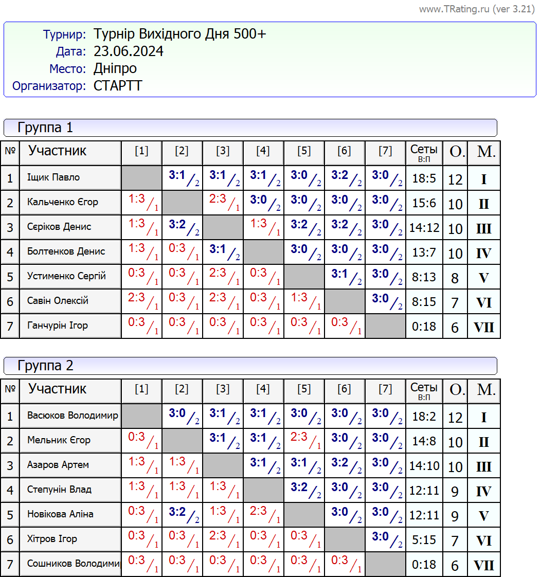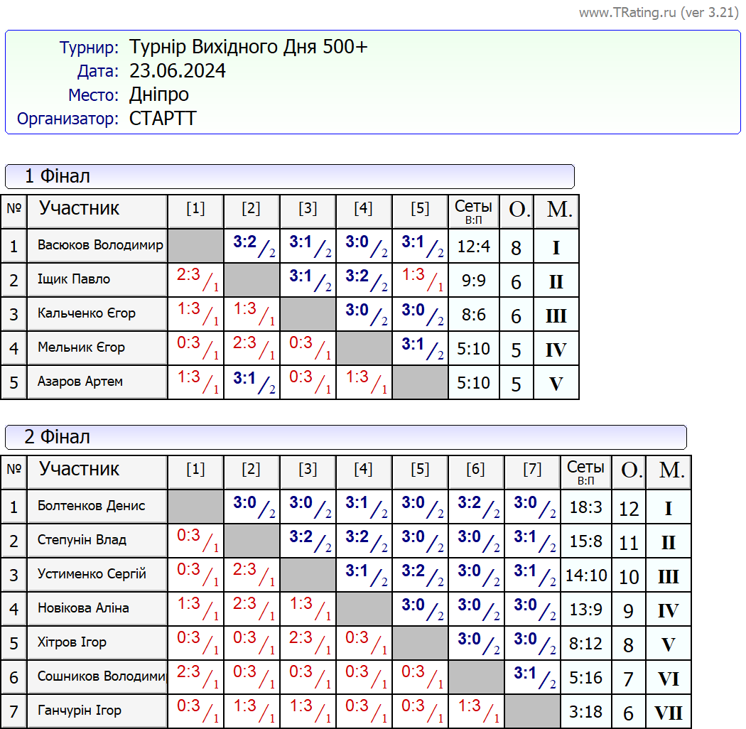 Результати турніру “Вихідного дня 500+ (Рейтинговий турнір)” за 23.06.2024