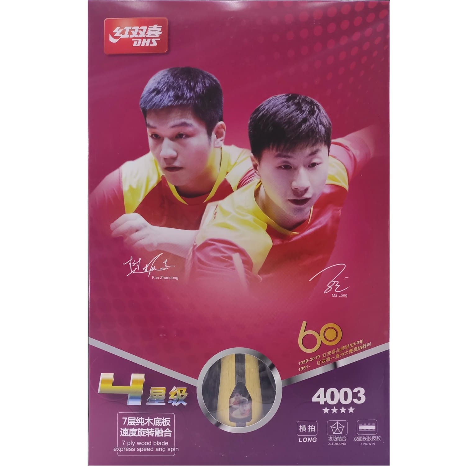 DHS T4003 – це професійна, високошвидкісна модель, яка оснащена накладками Hurricane 3 і С8 (шипи). Ракетка має високі показники обертання і швидкості. Модель рекомендується для використання також гравцями з невеликим досвідом, які віддають перевагу універсальному і захисному стилю гри. Характерною рисою ракеток фірми DHS є надійність і високу якість виконання.